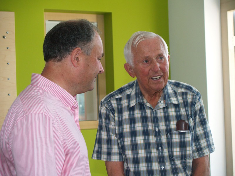 Dr. Bernhard Weigl im Gespräch mit Ferdinand Fastner (rechts), nach dessen Plänen vor 50 Jahren in Steinheims Westen der Kindergarten Sankt Peter verwirklicht wurde.
